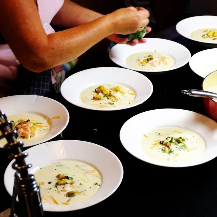 Hovedretten er hele hummere marinert i ovnen servert med tilbehør. Hummersuppe til forrett og pannacotta eller tiramisu til dessert.